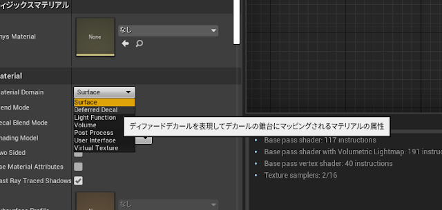 左下のMaterialの項目からMaterial DomainをDeferred Decalに、Blend ModeをTranslucentにしましょう。
